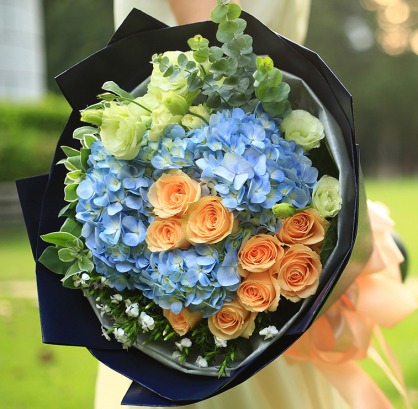 【鲜花花材】:   9朵香槟玫瑰,2支绣球花,配尤加利叶、桔梗、相思梅、高山积雪